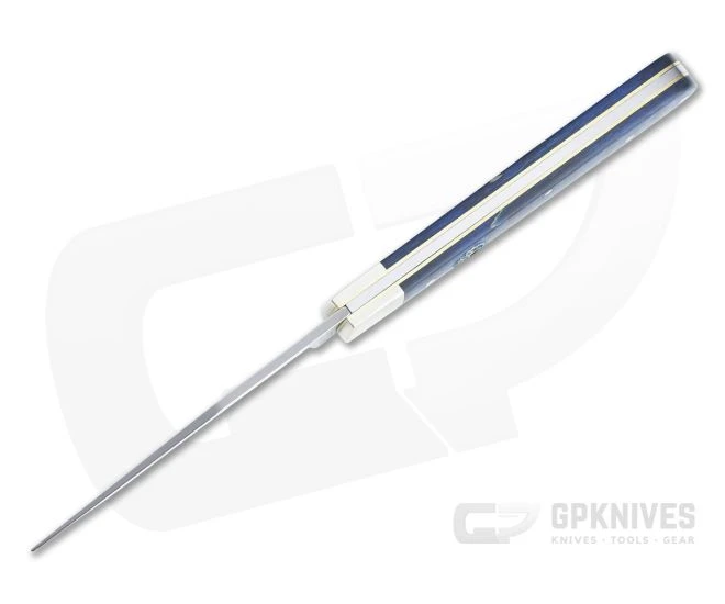 Handle: Mounted to brass liners with brushed nickel silver pins and bolsters the blue dyed, stabilized and striped curly maple wood covers offer a warm feel with a striking look. The front scale has a classic Tree Brand shield. A stainless steel back spring delivers smooth, snappy slip joint operation. Includes high-quality felt zipper pouch.
