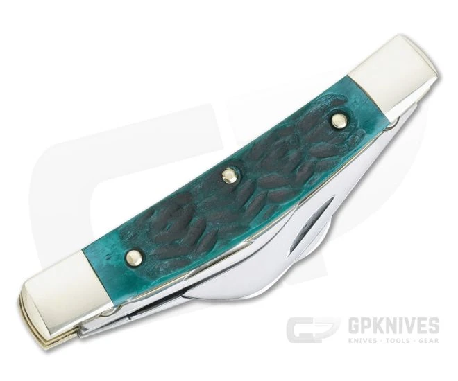 Essentially a large Congress pattern, the Bobcat has a crescent moon shaped handle square bolsters and a sheepfoot main blade. The knife has a total of four blades: dual sheepsfoot main blades paired with a coping and pen blade. This version comes with green pick (jigged) bone covers and German stainless steel blades.