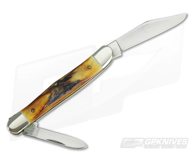 Case Centennial Stag Half Whittler was produced in 1989 and is part of the Centennial set released to commemorate 100 years of business. The set contained 100 pieces of various patterns. A total of 500 sets were produced containing bone and stag handles. Features mirror polished blades. Master clip blade stamped CASE XX 1889-1989 also inked ‘Case XX TESTED Centennial 1889-1989’. Back of secondary pen bears the pattern number 5208. Blades have reasonable snap. Both blades have a few small rubs. Nice looking stag with inlaid nickel silver shield which are chip and crack free. Nice addition to any collection or a classy little pocket carry.