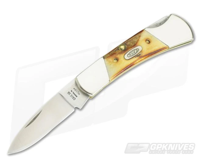 Case 1992 Stag Lockback is a classy little pocket knife. Features a satin finished drop point blade stamped Case XX Bradford Pa.1992 USA. The back of master bears the pattern number 51225L SS. Blade locks up solid and handles are chip and crack free. One to carry or collect.