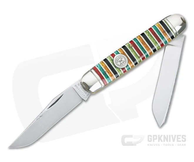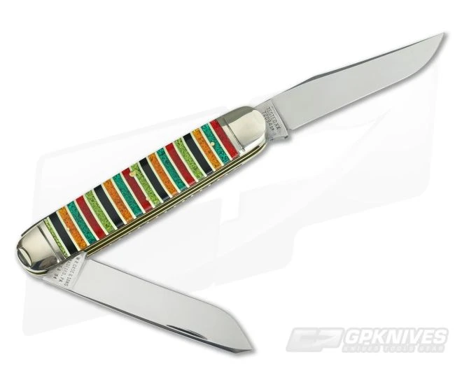 This Case 1994 Glitter Stripe Moose features a master clip and secondary spey blade. The front of the master and back of the spey are stamped W.R. Case and Sons Bradford Pa.USA 1994. The back of master blade is stamped with the pattern number 72094SP. Grooved pinched bolsters revel knives made in the old school tradition along with the Case Tested round shield. Both blades have good walk and talk with minuscule rubs on each. Handles are near perfect with no shrinkage. Knife produced by Blue Grass Cutlery under license from W.R Case and Sons in very limited production. Knife has never been used carried or sharpened.