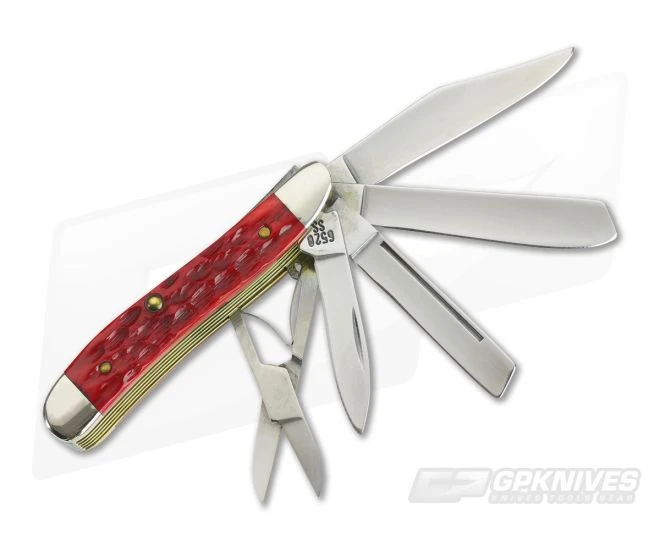 This Case 1996 5 blade red bone peanut also known as Big Nut was produced as a special factory order limited edition. Features 5 mirror polished blade variations: scissors, clip, spey, coping with long pull, and pen blade. Master clip stamped with Case long C and 4 dots. Back of pen bears the pattern number 6520 SS. All blades have half stops with exception of scissors. No rubs or wobble. Nice cherry red jigged bone handles are chip and crack free with inlaid nickel silver Case shield. Peanuts in general are very desirable and valued by collectors.