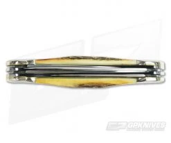 A very unique pattern, this Case Big Chief Canoe features four blades, two large spear and two smaller spear. This pattern was produced as an SFO in 1996 with several handle materials. This particular knife has thick, deep stag with lots of character, no cracks and a Case XX shield. Bears the pattern number 54131 SS denoting four blades and a traditional canoe frame. All blades are mirror polished with fair snap both open and closed. A rare pattern, there aren’t many of these to be found.