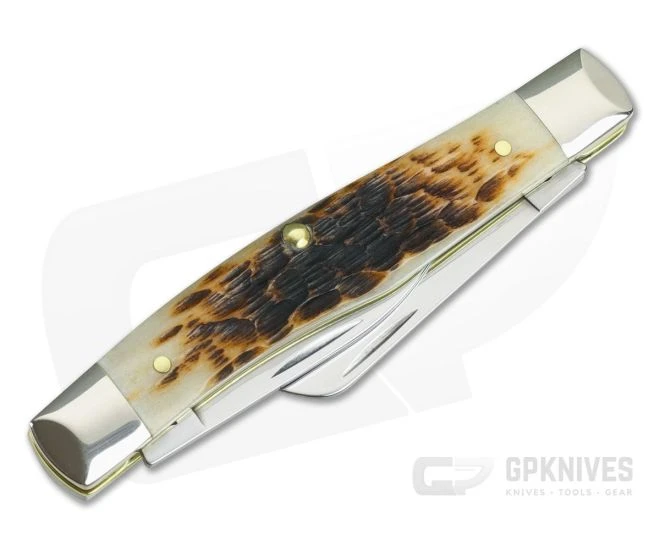 Case Stockman with amber bone handles and chrome vanadium carbon steel clip, sheepfoot and pen blades. Nail nicks for easy opening of blades. Nickel silver bolsters and brass liners.