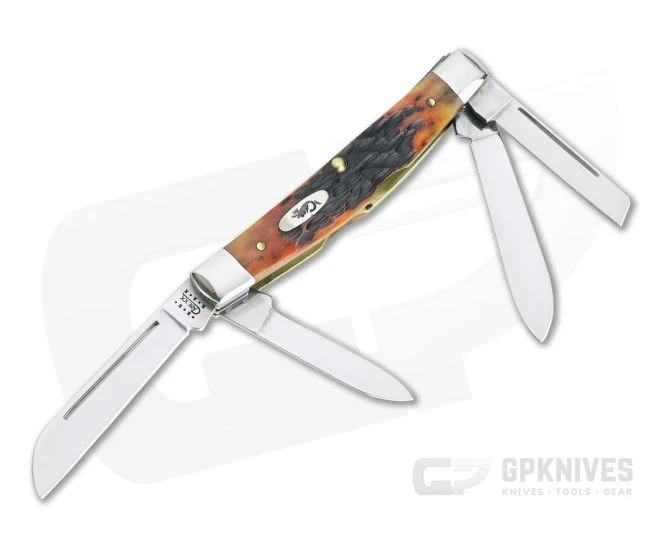 Very nice Autumn Bone Millennial Congress features sheepsfoot, spear, coping and pen blades. Master sheepsfoot blade is stamped Case with long C and 10 characters. All blades are mirror polished with half stops. Back of spear bears the pattern number 64052 USA SS. Handles are chip and crack free accented with a nickel silver shield. This specimen would be a nice addition to any collection. .