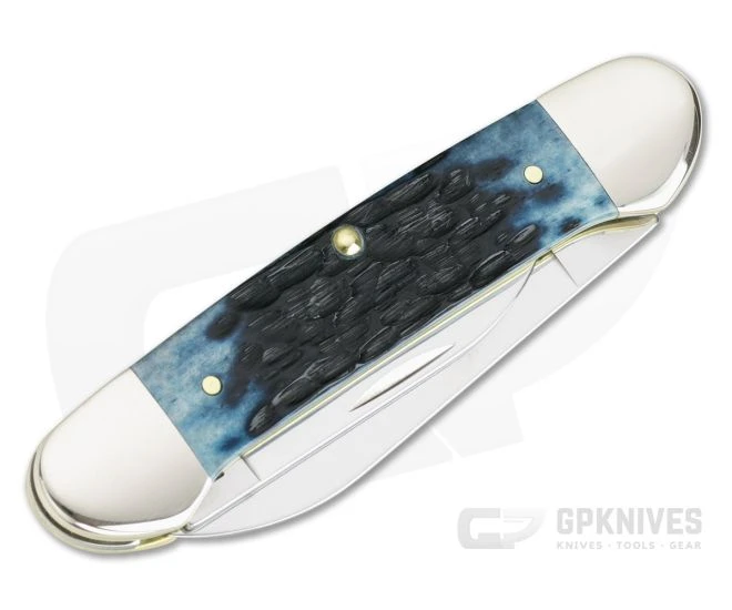 The dual Copperhead bolsters of this knife give it the iconic look from which it gets its name: The Case Canoe. The equal-end, slip joint knife pattern sports dual blades and multiple cover options. This version comes with Blue Denim Peach Seed Jig Bone covers and flat ground, polished Tru-Sharp stainless steel blades.