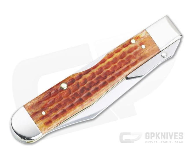 Handle: Nickel Silver bolsters frame the rugged Pocket Worn Harvest Orange bone covers fitted with brass pins to brass liners and equipped with Corn Cob jig texture for a tactile feel in the hand. The front cover sports a Case Oval shield. A mid-back lock construction offers simple and smooth locking operation of the blade with one-hand operation.