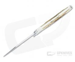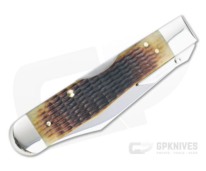 Handle: Nickel Silver bolsters frame the rugged antique bone covers fitted with brass pins to brass liners and equipped with Rogers Corn Cob jig texture for a tactile feel in the hand. The front cover sports a Case Bow Tie shield. A mid-back lock construction offers simple and smooth locking operation of the blade with one-hand operation.