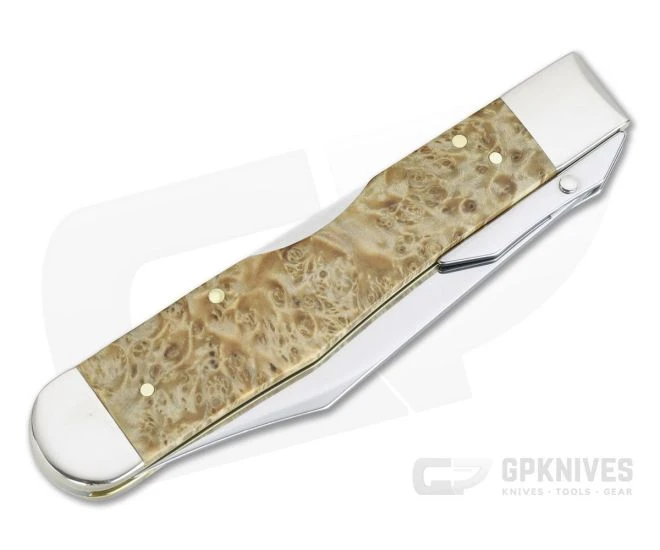 Handle: Nickel Silver bolsters frame the handsome, Smooth Natural Box Elder Burl Wood covers fitted with brass pins to brass liners. The front cover sports an engraved “Case XX” logo en lieu of a shield. A mid-back lock construction offers simple and smooth locking operation of the blade with one-hand operation.