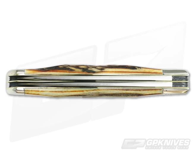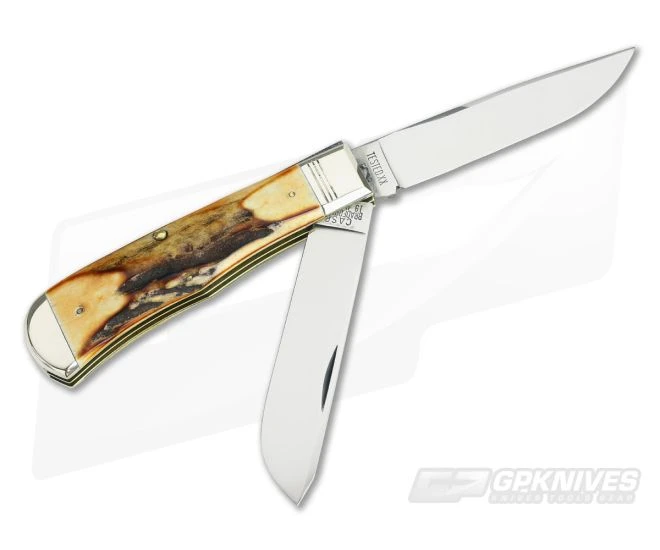 Case Classic 1992 Jumbo Trapper featuring thick stag handles and oval Case shield. This knife is a prime example of a Case Classic knife manufactured by Bluegrass Cutlery in the early 90’s under contract from Case. Knife has a long clip and spey blade which have both been mirror polished and bears the pattern number 5223 on the rear master tang. Bulky, genuine stag handles are present on both sides of the handle which are completely chip and crack free. These knives were produced in limited numbers and are highly valued among collectors.