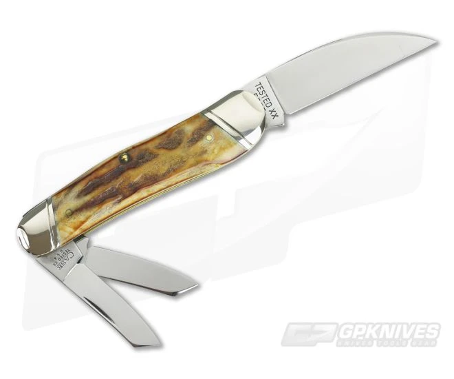 1993 Case Classic Seahorse Whittler with mirror polished carbon steel blades. Features a wharncliffe master blade stamped CASE with long C Tested XX USA 1993. Back of master also stamped TESTED XX with pattern number 5355. Also two secondary coping blades, one bears the Case XX TESTED circle shield while other secondary coping stamped CASE with long C TESTED XX USA. A few tiny minuscule rubs on master and secondary. All sitting on a tapered back spring with all blades having good snap. One coping blade has very slight wobble. Nice thick Sanbar stag accented with a nickel silver pinned bowtie shield which are chip and crack free. Pinched grooved slanted bolsters enhance the appearance of this great looking piece. Made in the old school tradition by Blue Grass Cutlery under license from W.R.Case ans Sons.