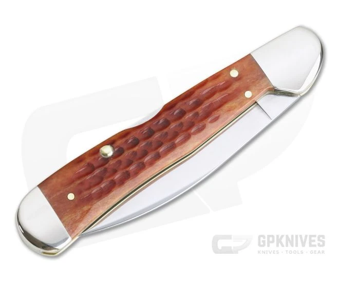 Handle: Polished Nickel Silver bolsters frame eye-catching Pocket Worn Harvest Orange Bone covers with Corn Cob Jigged texture. The covers are fitted with brass pins to brass liners and the front cover sports an iconic Arrowhead Shield. A sturdy back spring offers simple, smooth mid-back lock operation for secure use.