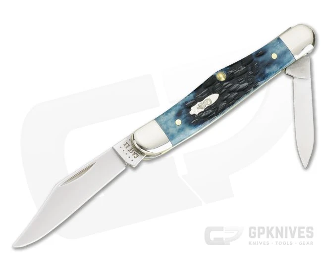 Handle: Blue Denim bone handle covers offer rugged and attractive style with classic Peach Seed jigged texture for added traction. They are attached to brass liners with brass pins in the traditional style. The scales are bordered by polished nickel silver bolsters and adorned with the Case Bombshell Script Shield.