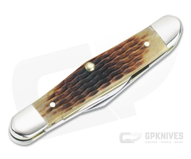 Handle: Antique bone handle covers offer an attractive rustic style with Rogers Corn Cob Jig texture for added traction. They are attached to brass liners with brass pins in the traditional style. The scales are bordered by polished nickel silver bolsters and adorned with the Case Bow Tie shield.