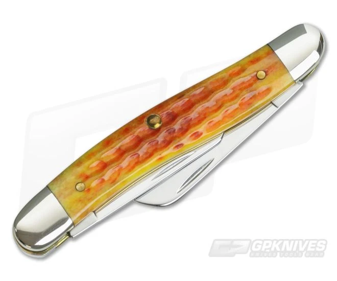 Case Medium Stockman with harvest orange bone handles and Tru-Sharp stainless steel clip, sheepfoot and pen blades. Nail nicks for easy opening of blades. Nickel silver bolsters and brass liners.