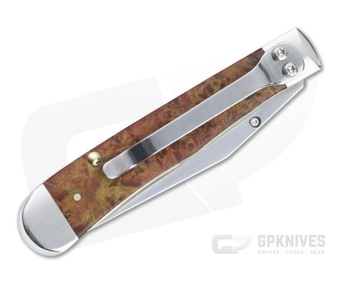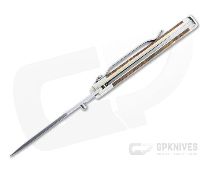 Handle: Polished Nickel Silver bolsters frame smooth, Autumn Maple Burl wood covers for a handsome, classic look. Supplemented with a stainless torsion bar for opening and stainless liner lock for safe use, the handles have standard brass liner construction. The front handle sports a polished Case Diamond shield.