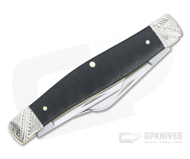 Handle: Smooth, black Ebony wood covers are fit between two sets of nickel silver bolsters that have been tool worked for a textured feel and custom look. Ebony has a warm, organic feel in hand with solid durability and weather resistance. The covers are attached with brass pins to brass liners in the traditional style. The front cover sports a Case Bow Tie shield while dual stainless steel back springs deliver smooth, simple and secure slip-joint operation.
