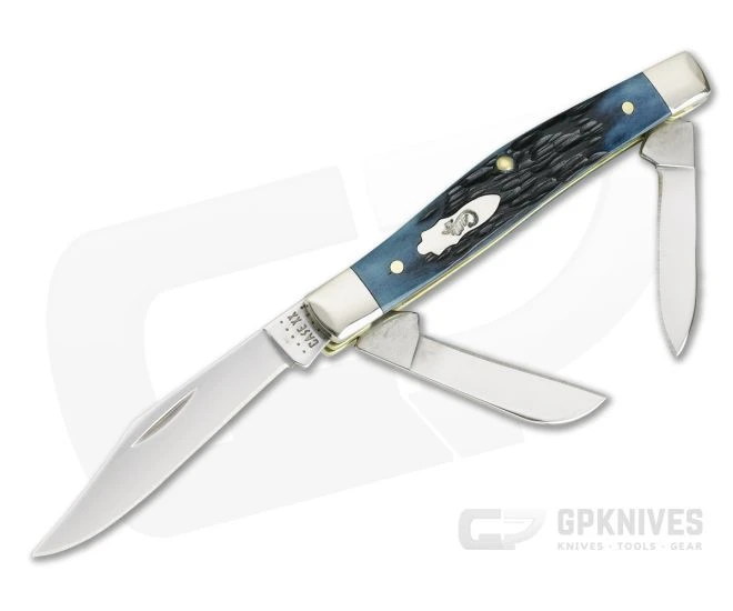 Handle: The rugged Blue Denim bone covers are fit between two sets of polished nickel silver bolsters and have a great in-hand feel with Peach Seed Jigged texture for traction. The covers are attached with brass pins to brass liners in the traditional style. The front cover sports a Case Bombshell script shield while dual stainless steel back springs deliver smooth, simple and secure slip-joint operation.