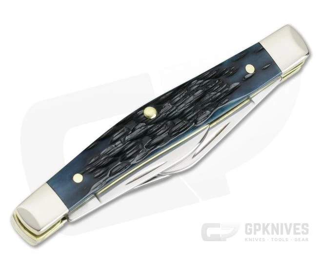 The Stockman is believed to be a scaled down version of the Cattleman pattern and shares similarities in the design. The Medium Stockman is the second largest of this pattern and comes with a main clip point blade and two auxiliary blades. This version comes with rugged and handsome Blue Denim Peach Seed Jigged Bone covers and polished Tru-Sharp blades.