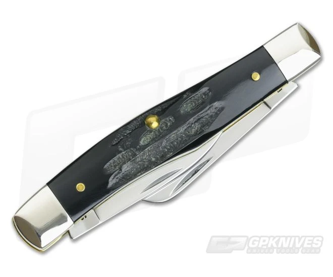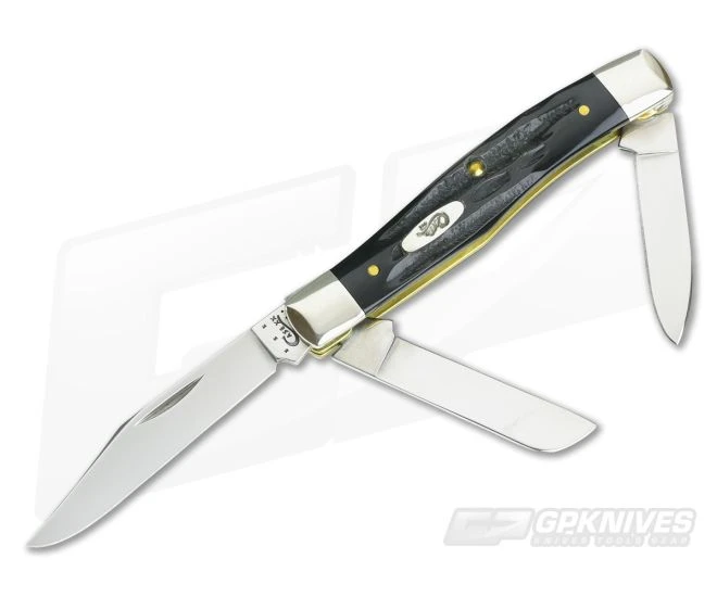 Case Medium Stockman pattern outfitted in handsome dark buffalo horn scales. This classic pattern features three stainless steel blades, a clip, pen and sheepfoot with a mirror polish finish and nail-nick openers. The blades are sandwiched between brass liners over which jigged horn handle scales have been pinned. Nickel silver bolsters and a nickel silver oval shield accent the handle. Brand new directly from W.R. Case & Sons.