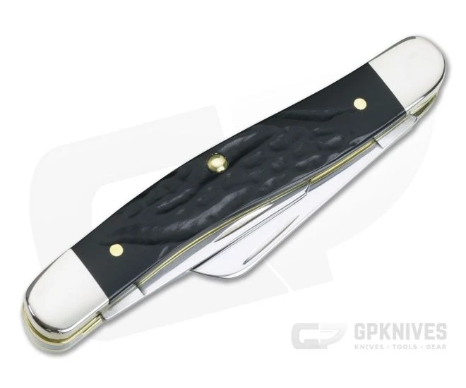 The Case Medium Stockman with rough black synthetic handles is a revival of a WWII era handle material known as “gum fuddy”. This Medium Stockman pattern features black synthetic handles with light jigging giving the knife a classic look and feel. The black synthetic handle is nearly indestructible and has been pinned to the brass liners of the knife with brass pins. You will also find the classic oval Case shield on the front side of the handle. The rough black handle scales are accented with nickel silver bolsters. Housed within the handle are three mirror polished tru-sharp stainless steel blades, a clip, sheepsfoot and spey blades. Brand new direct from W.R. Case & Sons.