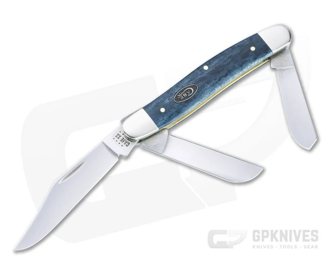 Considered a scaled down version of the Cattleman pattern, the Case Stockman shares several similarities in the design. The Medium Stockman is the second largest of this pattern and comes with a main clip point blade and two auxiliary blades. This version comes with smooth Mediterranean Blue bone covers, polished Tru-Sharp blades and polished nickel silver bolsters.