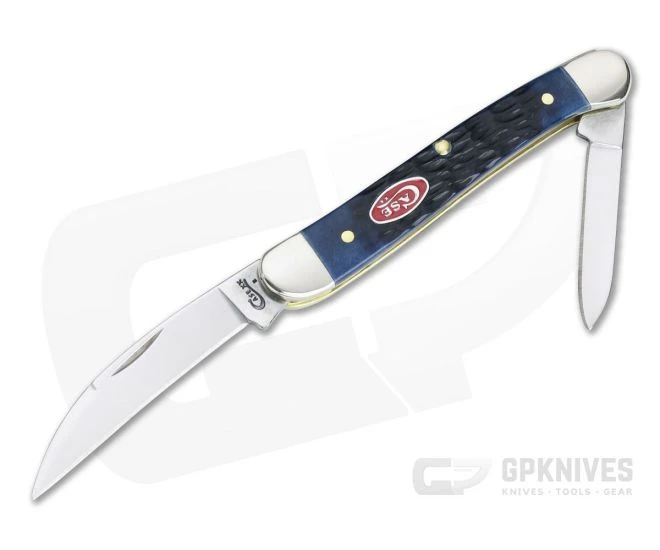 Case Mini Copperhead knife with Navy Blue Jigged Bone handles and rounded bolsters makes for a great companion. This pattern features two Tru-Sharp stainless steel blades, a wharncliff and pen with a mirror polish finish and nail-nick openers. The bone handles have been attached to brass liners with brass pins and also boasts a red oval Case Shield on the front side. Brand new directly from W.R. Case & Sons.