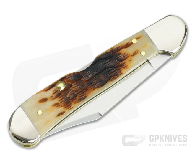 Case Mini Copperlock pattern with amber bone handles and a single polished tru-sharp stainless steel blade. The single blade can be easily opening by utilizing the extended nail nick and locks into the open position providing for safe use. The blade can easily be closed by gently compressing the back lock when finished using. The blade is sandwiched between brass liners over which jigged amber bone handle scales have been pinned. Nickel silver bolsters and a nickel silver oval shield accent the handle. Brand new directly from W.R. Case & Sons.