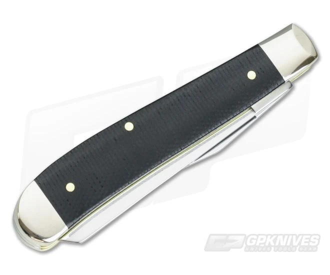 The Handle: Black Canvas Laminate covers are attached to brass liners with nickel silver pins in the traditional style. The laminate material is highly durable and offers plenty of traction for every day use. The front cover sports an embossed Case Shield. Simple slip-joint operation provides smooth and secure operation of the knife while in use.