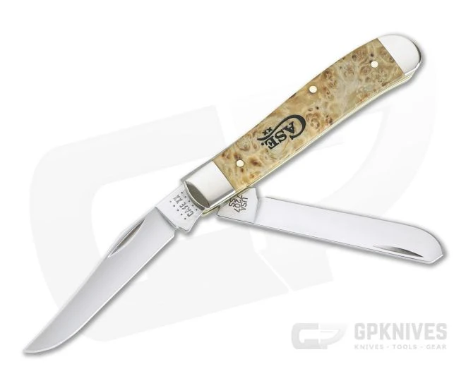 The classic Case Trapper pattern is a large, traditional folder that begs to be used. This Mini Trapper is a more carry friendly version of the classic slip joint design offering two large Tru-Sharp stainless steel blades at the primary end of the robust and comfortable handle made with nickel silver bolsters and Smooth Natural Box Elder burl wood covers. Great for daily use or as an addition to any Case collection. Rugged, handsome and timeless.