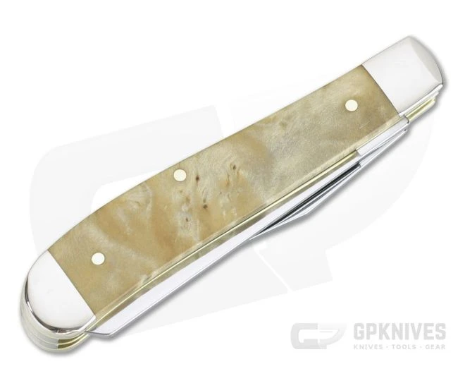 Handle: Smooth Natural Box Elder burl wood covers are rugged and timeless with a warm, natural feel and visually striking, rippled look. Framed by nickel silvers bolsters the scales are attached to brass liners with brass pins in the traditional style and feature a “Case XX” logo engraved on the front scale.
