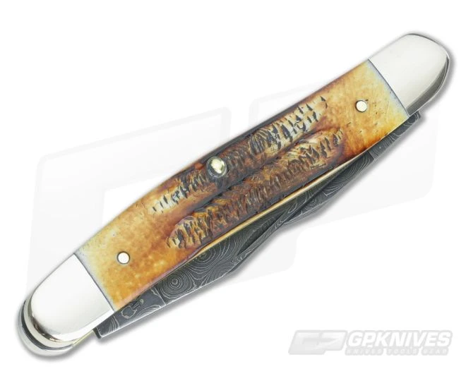 Timeless and traditional, this Case Muskrat is a reminder of simpler times. The classic slip joint design offers two identical clip point blades found at either end of the Bone Stag handle. Great for daily use or as an addition to any Case collection. This Muskrat is elevated in class and style with the use of Damascus pattern welded steel for both blades.