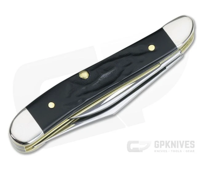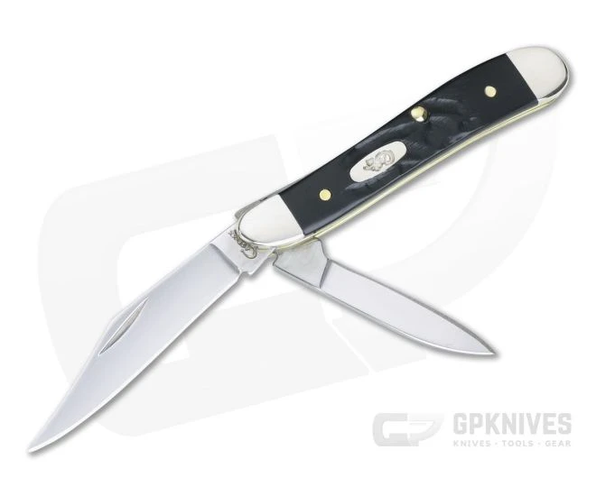 The Case Peanut with rough black synthetic handles is a revival of a WWII era handle material known as “gum fuddy”. This Peanut pattern features black synthetic handles with light jigging giving the knife a classic look and feel. The black synthetic handle is nearly indestructible and has been pinned to the brass liners of the knife with brass pins. You will also find the classic oval Case shield on the front side of the handle. The rough black handle scales are accented with nickel silver bolsters. Housed within the handle are two mirror polished tru-sharp stainless steel blades, a clip and pen blade. Brand new direct from W.R. Case & Sons.