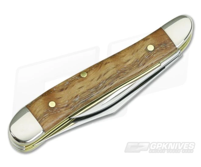 The small, serpentine-shaped jack knife from Case knives known as the Peanut comes equipped with dual blades mounted at the same end of the elegantly curved handle and beautiful Smooth Natural Curly Oak covers. The Peanut makes a great choice for dress carry and easily finds a home in a fifth pocket or coin pocket.