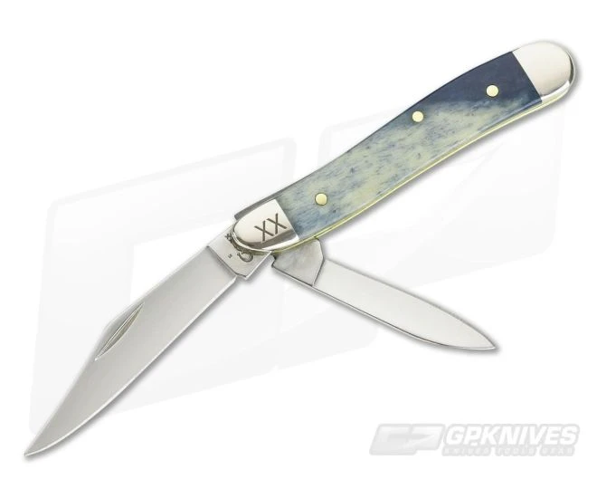 Handle: Smooth Navy Blue Giraffe Bone covers offer a stylish and attractive look framed by nickel silvers bolsters. Forgoing a shield for a cleaner look the top front bolster is marked “XX” and exhibits the quality and refinement a Case knife offers. The scales are attached to brass liners with brass pins in the traditional style. Slip joint operation with solid half-stop makes for smooth and secure operation.