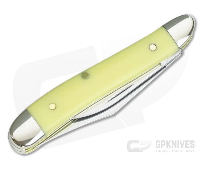 Case Peanut with yellow synthetic delrin handles and chrome vanadium carbon steel clip and pen blades. Nail nicks for easy opening of blades. Nickel silver bolsters and brass liners.