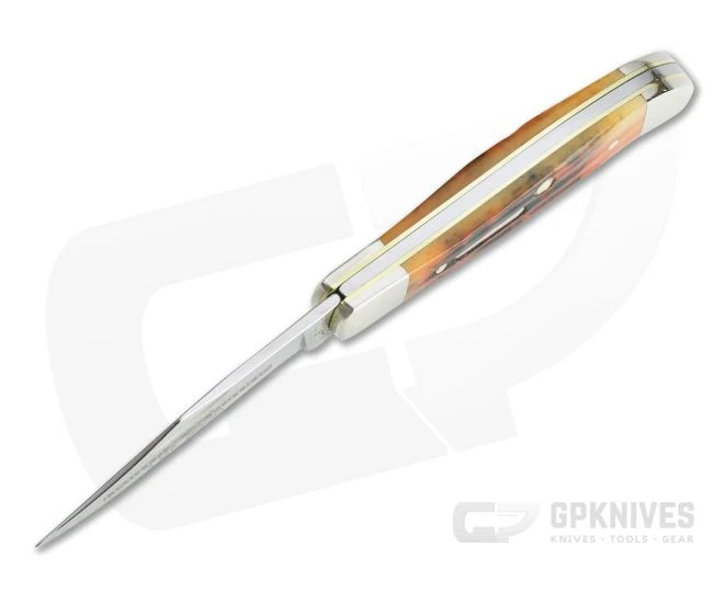 Handle: Second Cut Autumn Bone covers have an organic grooved texture and warm, Fall tones. Stylish and attractive, the covers are framed by polished nickel silvers bolsters with a matching Case Bar Shield. The scales are attached to brass liners with brass pins in the traditional style.
