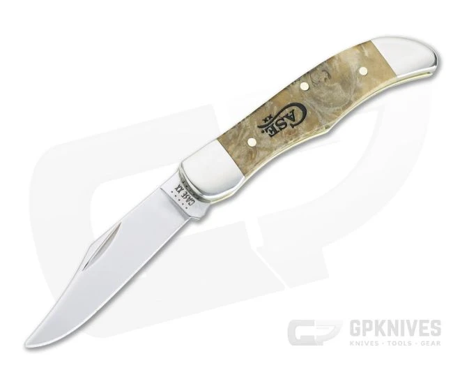 Handle: The Smooth Natural Box Elder Burl Wood covers are fit between two sets of polished nickel silver bolster and have a great in-hand feel and striking look. The covers are attached with brass pins to brass liners in the traditional style. The front cover sports an engraved “Case XX” logo while a stainless steel back spring delivers smooth, simple and secure slip-joint operation.