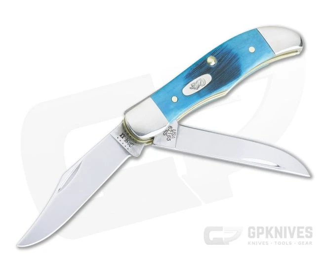 Handle: The rugged Caribbean Blue Sawcut Jig Bone covers are fit between two sets of polished nickel silver bolster and have a great in-hand feel. The covers are attached with brass pins to brass liners in the traditional style. The front cover sports an embossed Case Oval Script Shield while dual stainless steel back springs deliver smooth, simple and secure slip-joint operation.