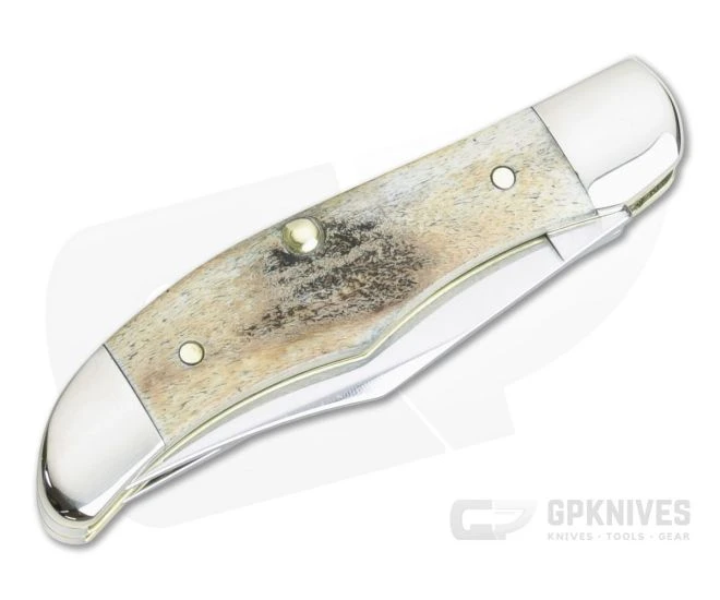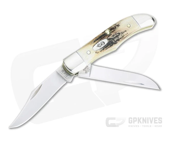 Handle: The rugged Genuine Stag covers are fit between two sets of polished nickel silver bolster and have a great in-hand feel. The covers are attached with brass pins to brass liners in the traditional style. The front cover sports an embossed Case Oval Script Shield while dual stainless steel back springs deliver smooth, simple and secure slip-joint operation.