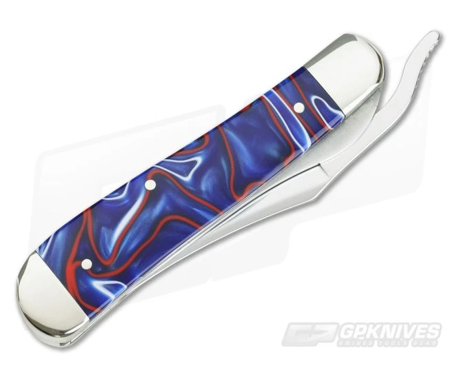 Case Russlock pattern with Patriotic Kirinite™ handle scales that are fully polished and pinned to stainless liner with one used as a lock-bar. This new material holds the color all the way through and is just as tough and durable as Corian™. Clip point style blade is highly polished Tru-Sharp stainless steel and can be easily opened one-handed. Brand new from W. R. Case and Sons.