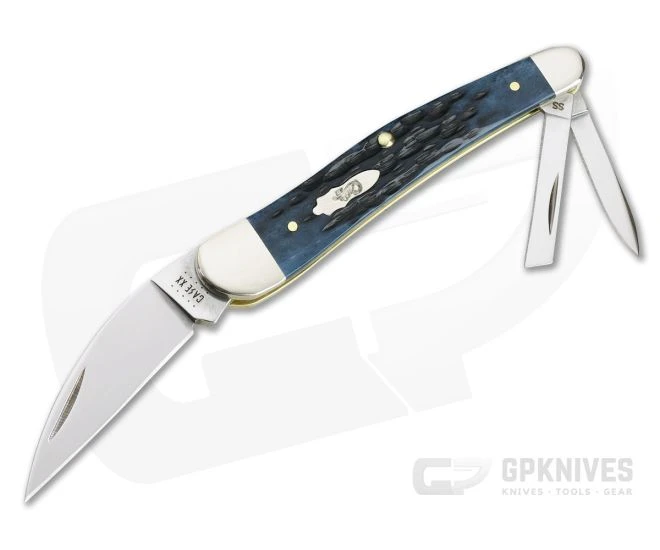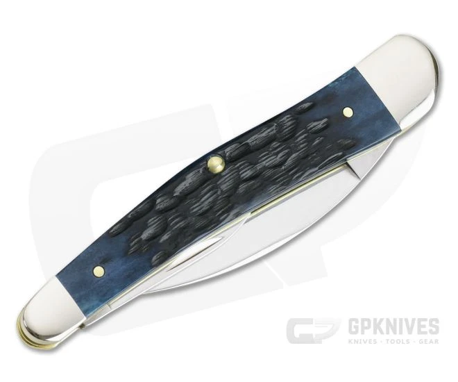 Timeless and traditional, this Case Seahorse Whittler is perfect for front porch sitting’ and sweet tea drinking’ while whittling away on your latest project. Inspired by the classic, English Wharncliffe Whittler this simple slip joint design offers three unique blades shapes and a comfortable handle for daily use. Rugged, handsome and ready for use this version comes with Tru-Sharp stainless steel blades and Blue Denim Peach Seed Jig Bone covers.
