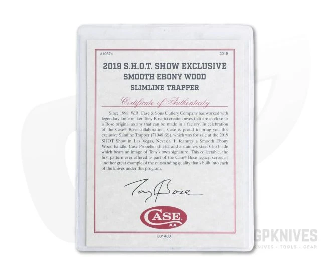 Timeless and traditional, the design of this Case Slimline Trapper will remind you of simpler times. The classic slip joint design offers a single blade with a svelte Smooth Ebony Wood handle. Great for daily use or as an addition to any Case collection. This limited Tony Bose SHOT Show 2019 Slimline Trapper comes with Tony Bose signature on the blade and a Certificate of Authenticity.