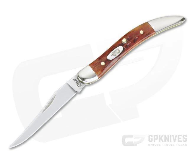 Measuring only 3 inches long, the clasp style Small Texas Toothpick dates back to the turn of the 20th century. The long Clip blade is pointed for making small holes or light digging, while the slim shape allows for comfortable pocket carry. This version comes with rugged Pocket Worn Harvest Orange Corn Cob Jig Bone covers and a Tru-Sharp stainless steel Clip Point blade.