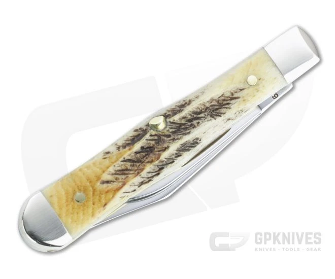 Handle: In classic Case style the handle consists of solid steel back springs with brass liner and pin construction. Polished nickel silver bolsters frame rugged Case BoneStag covers, bone treated to look like stag for visual appeal and traction. The sturdy back springs offer simple, smooth slip joint operation with a solid half stop for safety. A Case “Oval Script” shield decorates the front.