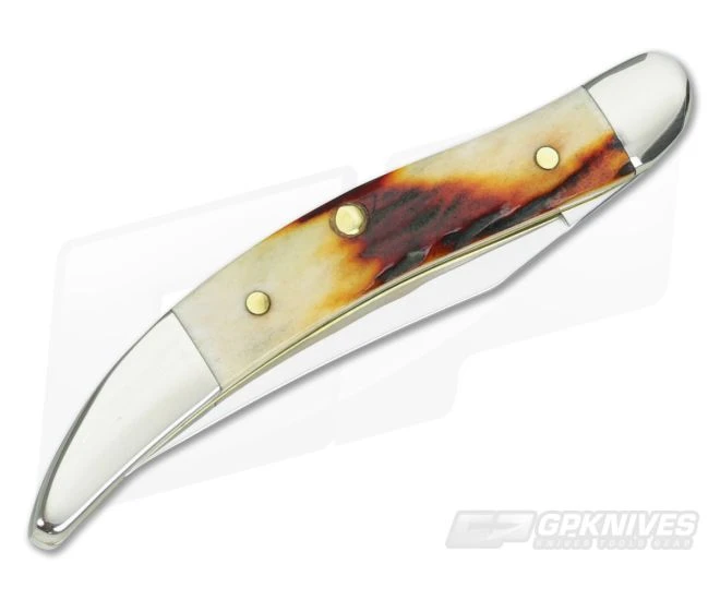 The Handle: Nickel Silver bolsters frame handsome Red Stag covers fitted with brass pins to brass liners. The Tiny Toothpick has an iconic pattern that curves and tapers to a horn shaped bolster at the end of the handle. The front cover sports an Oval Shield. Slip joint operation offers simple and smooth non-locking operation of both blades from the top bolster.