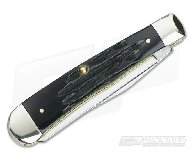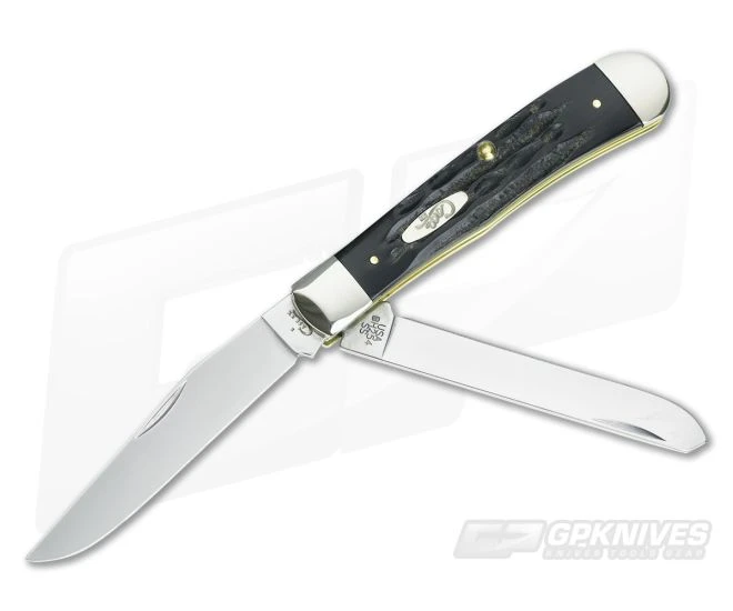 The Case Trapper Jigged Buffalo Horn is one of nine classic patterns to receive this specially crafted and hand-finished handle. The Trapper is a two blade knife featuring a clip and spey, composed of mirror polished tru-sharp stainless steel. Handsome Water Buffalo Horn has been uniquely jigged then attached to the liners via brass pins. Polished nickel silver bolsters, brass liners and an oval Case shield accent the natural horn handle. Brand new directly from Case Knives.