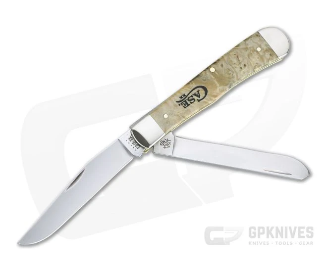 The classic Case Trapper pattern is a large, traditional folder that begs to be used. The classic slip joint design offers two large Tru-Sharp stainless steel blades at the primary end of the robust and comfortable handle made with nickel silver bolsters and Smooth Natural Box Elder burl covers. Great for daily use or as an addition to any Case collection. Rugged, handsome and timeless.