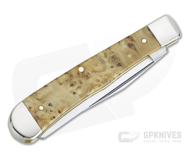 Handle: Smooth Natural Box Elder burl covers are rugged and timeless with a warm, natural feel and visually striking look. Framed by nickel silvers bolsters the scales are attached to brass liners with brass pins in the traditional style and feature a “Case XX” logo engraved into the front scale.