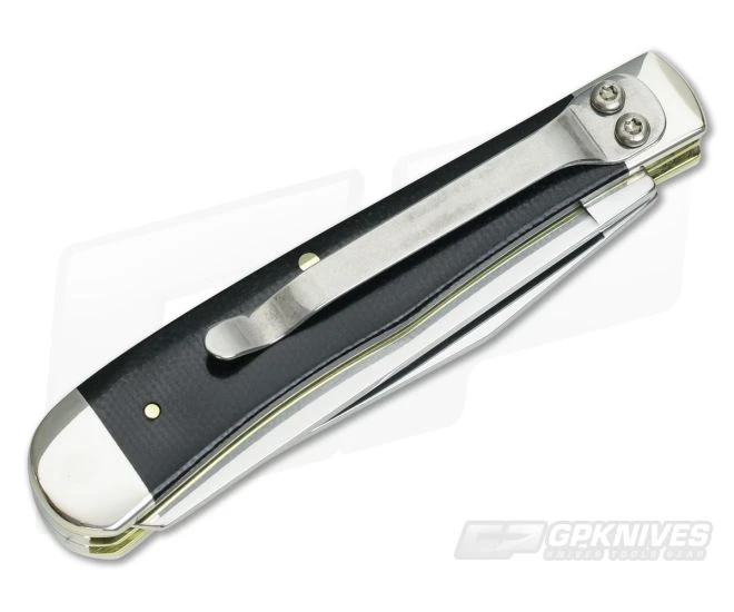 The Handle: Black Canvas Laminate covers are attached to brass liners with nickel silver pins in the traditional style. The laminate material is highly durable and offers plenty of traction for every day use. The front cover sports an embossed Case Shield while the reverse is equipped with a sturdy, stainless steel clip for pocket carry. Simple slip-joint operation provides smooth and secure operation of the knife while in use.